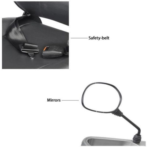 It comes with LED headlights, turn signals, rearview mirrors, automatic braking, and anti-tip wheels for enhanced safety and visibility.