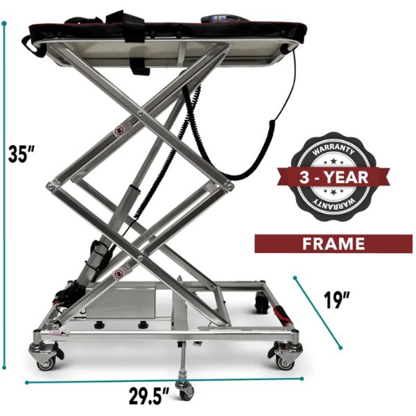 The GO-Lift is made to be easily stored and transported, measuring a mere 29.5" x 19" x 32.8" when unfolded and 29.5" x 19" x 9.5" when folded. It offers flexibility and convenience in a range of situations, with a minimum height of 9.5" from the ground and a maximum height of 32.8".