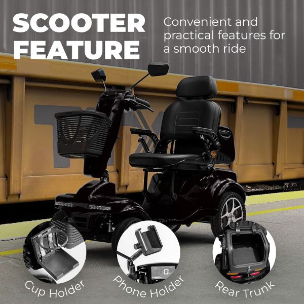 The scooter comes with an 18.5-inch memory foam captain’s seat, adjustable armrests, and an optional swivel seat for added ease of getting on and off.