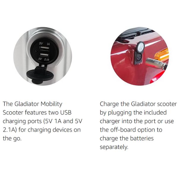 The Gladiator makes it super easy to stay connected while you're on the go. It has two built-in USB charging ports, so you can charge your phone, tablet, or other devices while you ride. One port is a 5V 1A, perfect for smaller things like your phone, and the other is a 5V 2.1A, which charges bigger devices faster. Now, you don’t have to worry about your battery running out you can keep your devices powered up wherever you go.