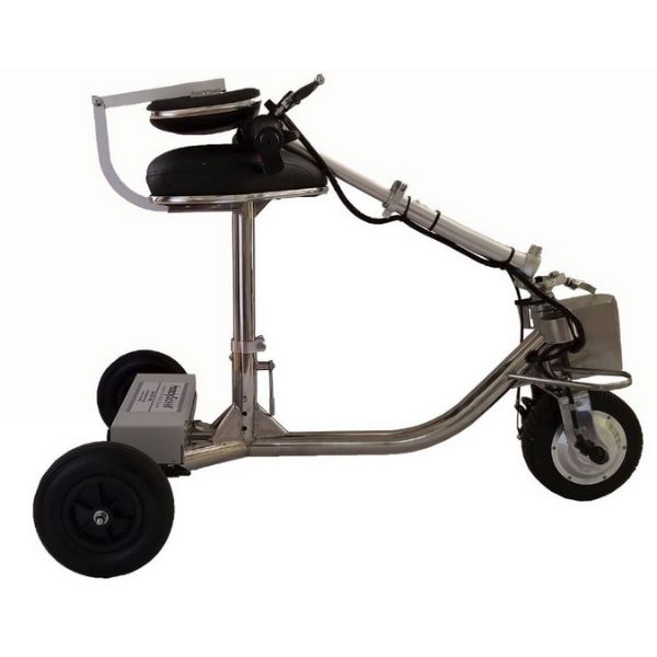 The HandyScoot is completely user friendly and has a weight capacity of 350 lbs.  The frame is built close to the ground, making it easy to mount.  A lower clearance gives you more freedom to take on the world outside.  A more durable vinyl pad stands up to repeated use, cutting back the amount of wear and tear and eliminating unnecessary replacements.  The battery on this lightweight travel scooter comes with an embedded plug which means you simply place it upon the controller.
