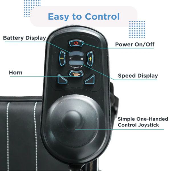 The user-friendly joystick and powerful dual drive system on this electric wheelchair make it easy to maneuver, allowing for quick and safe movement. Its compact design allows it to easily fit through doorways and navigate tight spaces, making it incredibly agile and precise. The powerchair's two brushless motors operate independently, allowing for agile and accurate turning.