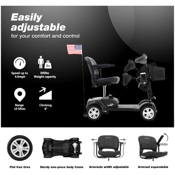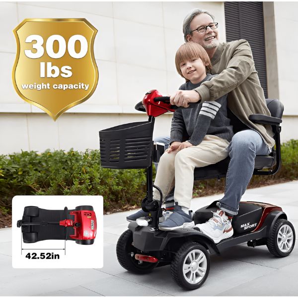 The Max Sport's thicker 4 inch deluxe stadium style seat and plush backrest offer firm support with supportive cushioning, ensuring a comfortable ride. The adjustable tiller and width-adjustable armrests allow you to relax your body while driving, adding both comfort and flexibility when traveling. Additionally, the two padded armrests can be flipped up or down, and the seat swivels, making it more convenient to get on and off the scooter.