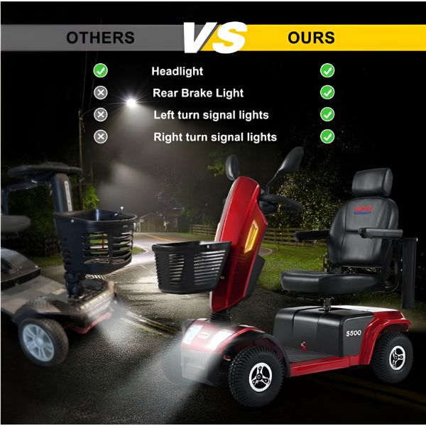 In addition to the superior tire system, the S500 4-wheel scooter features front and rear LED lights. The LED lights have two functions: they increase the scooter's visibility to others on the road while also providing lighting for safe driving. This provides a safer riding experience, particularly in low-light conditions or when riding at night.