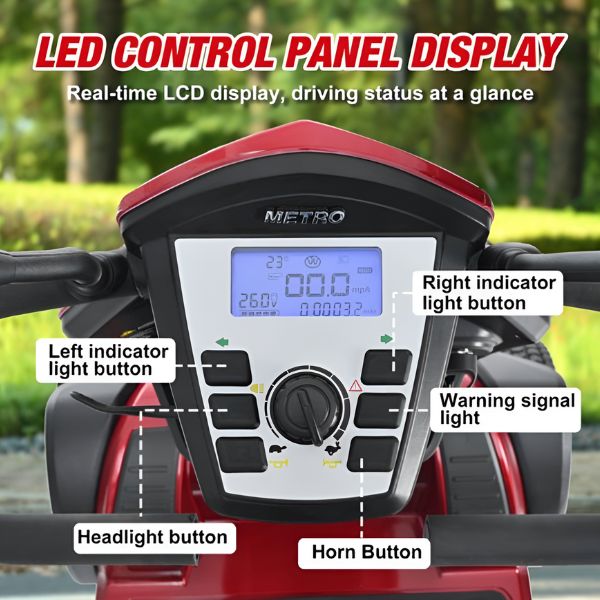 With its straightforward design, the control panel is easy to use and provides all of the essentials for operating the scooter. The tiller is a delta tiller with ambidextrous controls so you can accelerate forward or backwards with just one hand. Its easy-to-use interface guarantees smooth and seamless operation. Getting around the settings is made simple by the easy-to-read LED control panel display, which provides clear visual information on the scooter's important driving information such as speed, battery life, and odometer. For added convenience, the panel has a variable speed dial and even a horn.