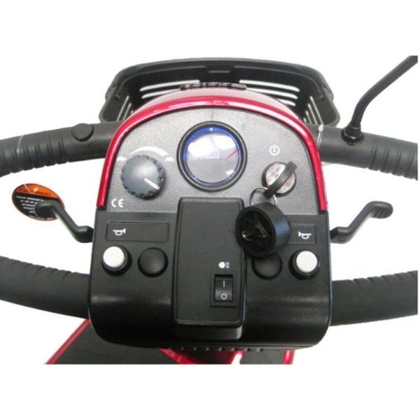 The control panel features large controls where you have your battery gauge, speed control and even a horn. This is also where you can use the LED headlight, so the fun doesn't have to end when the sun goes down. Perhaps best of all, this unit is made by Pride Mobility, who not only is one of the best mobility brands in the industry, but also offers one of the most comprehensive warranties as well.