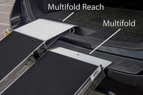 Prairie View's Multifold Reach Ramp allows you to load your manual wheelchair, scooter or power wheelchair into a vehicle with ease. This ramp is similar to Prairie View's Multifold ramp, but with an extension on one end that spans the distance from the bumper to the interior of the vehicle.