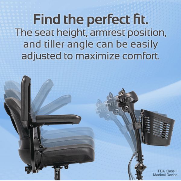 Adjust your scooter to fit you perfectly—raise or lower the seat, move the armrests, and tilt the tiller to your ideal driving position. The swivel seat makes getting on and off easy and safe, especially in tight spaces. These features reduce strain on your body, improve posture, and help you stay comfortable and supported during long outings or daily use.