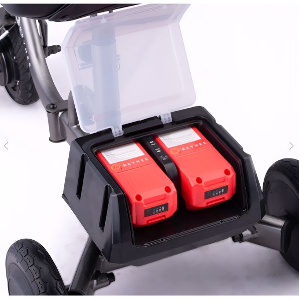 The Reyhee Triad 3-Wheel Mobility Scooter features a convenient and easily accessible battery box designed to hold and protect the battery packs. This well-designed battery compartment ensures that the batteries are securely housed, protecting them from external elements and potential damage. The accessibility of the battery box allows for easy battery removal. This is necessary for when you are traveling on an airline with your scooter as all airlines require you to remove the battery and bring on board with you..